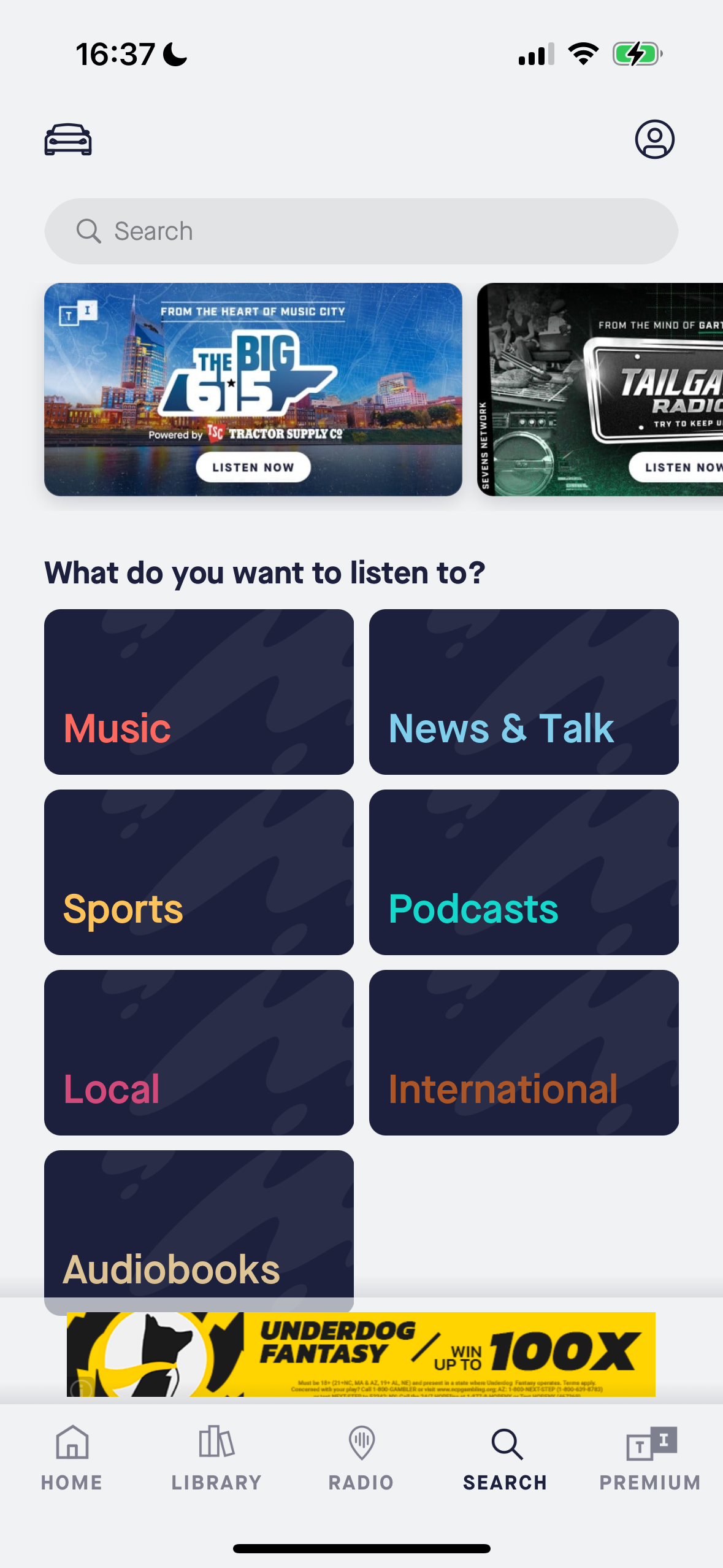 | 2. If you have a specific stations or podcast in mind, tap the "Search" icon to find it by name or keyword. |